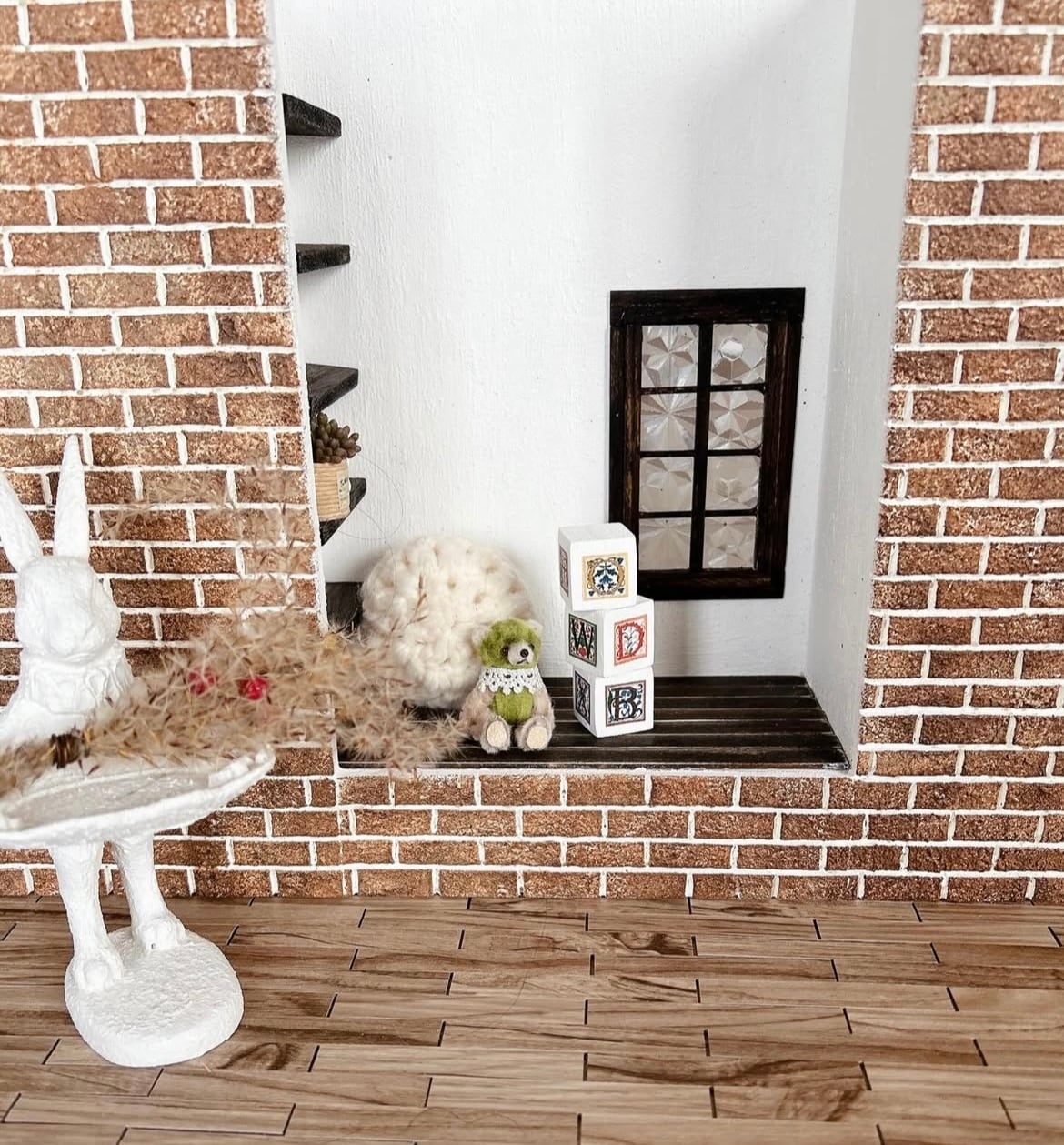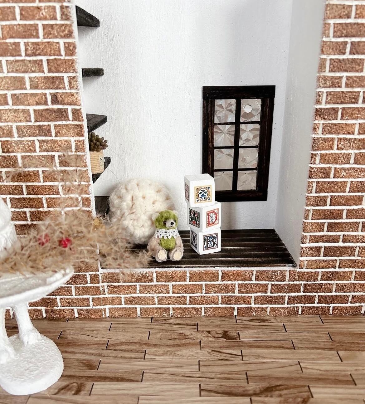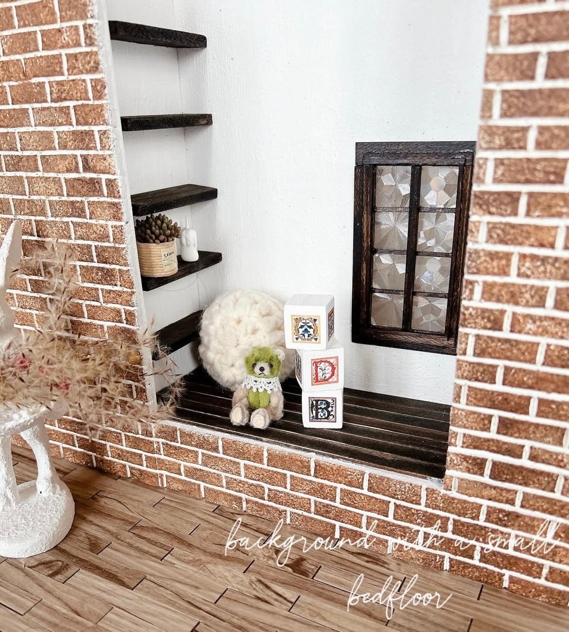 プチブライスベッドフロアのある背景ボードブラウンレンガ