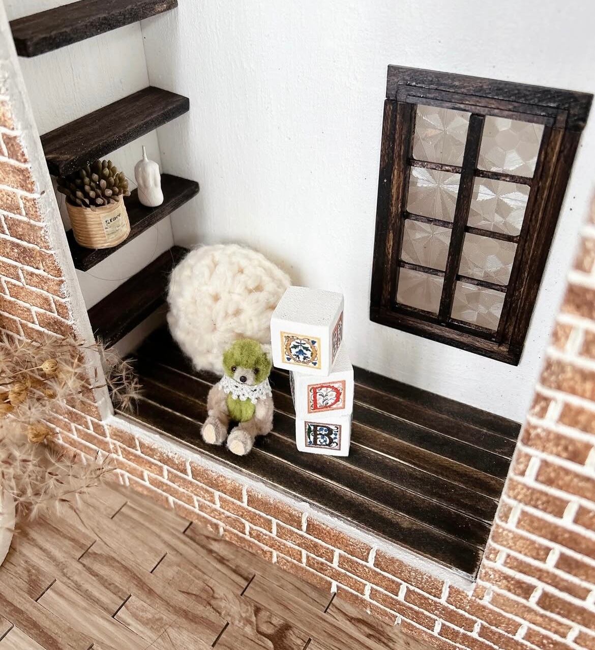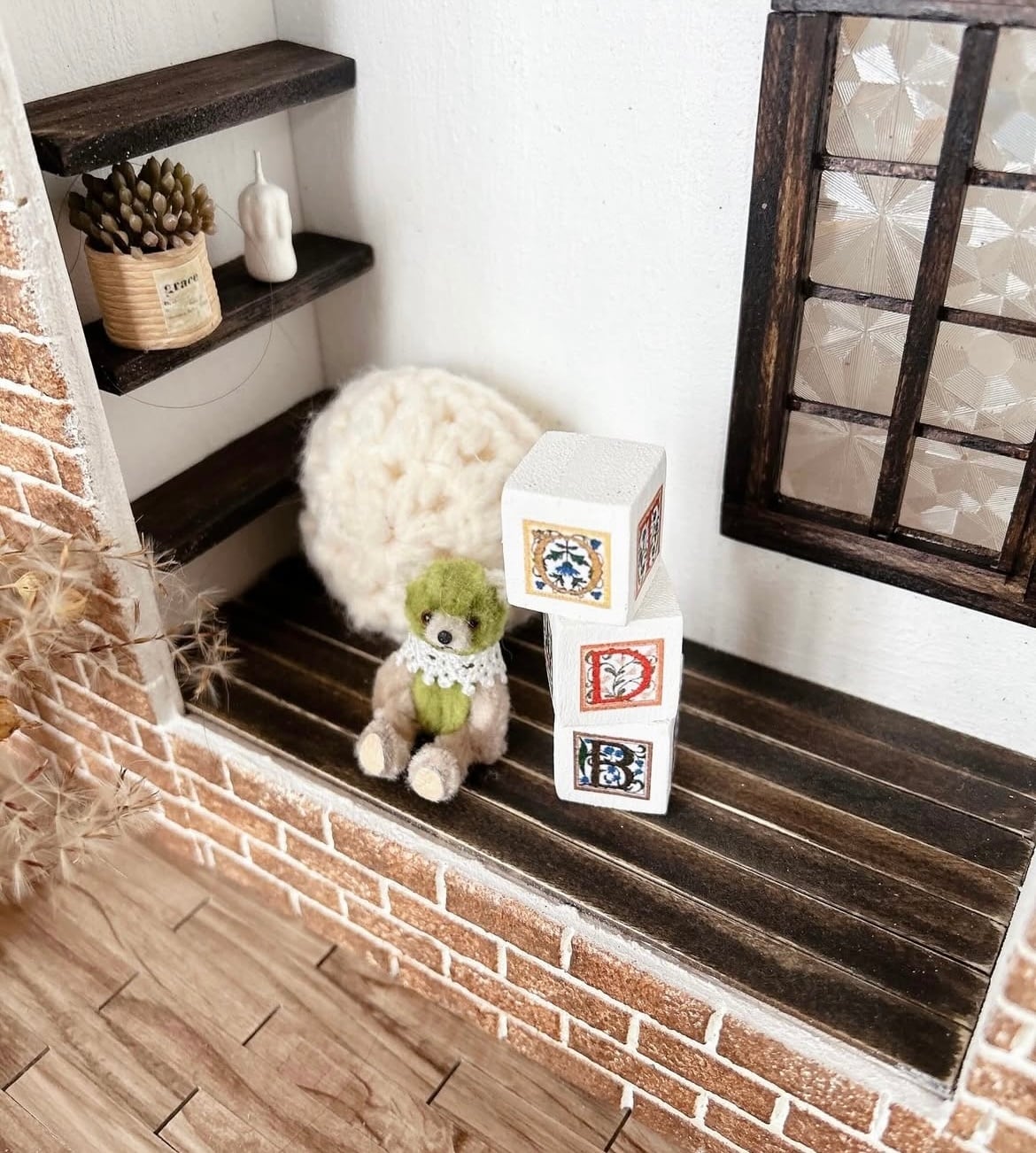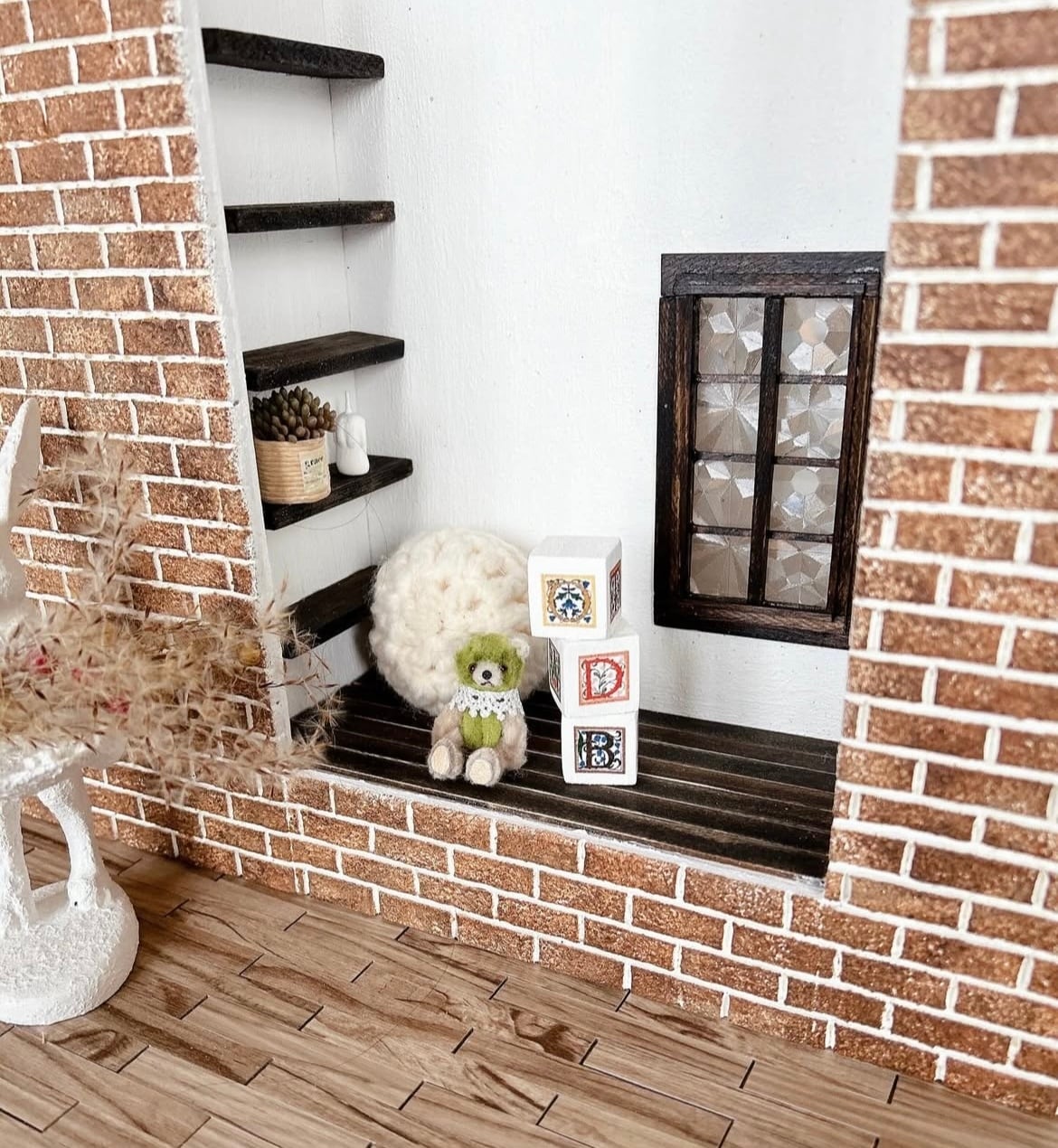 プチブライスベッドフロアのある背景ボードブラウンレンガ
