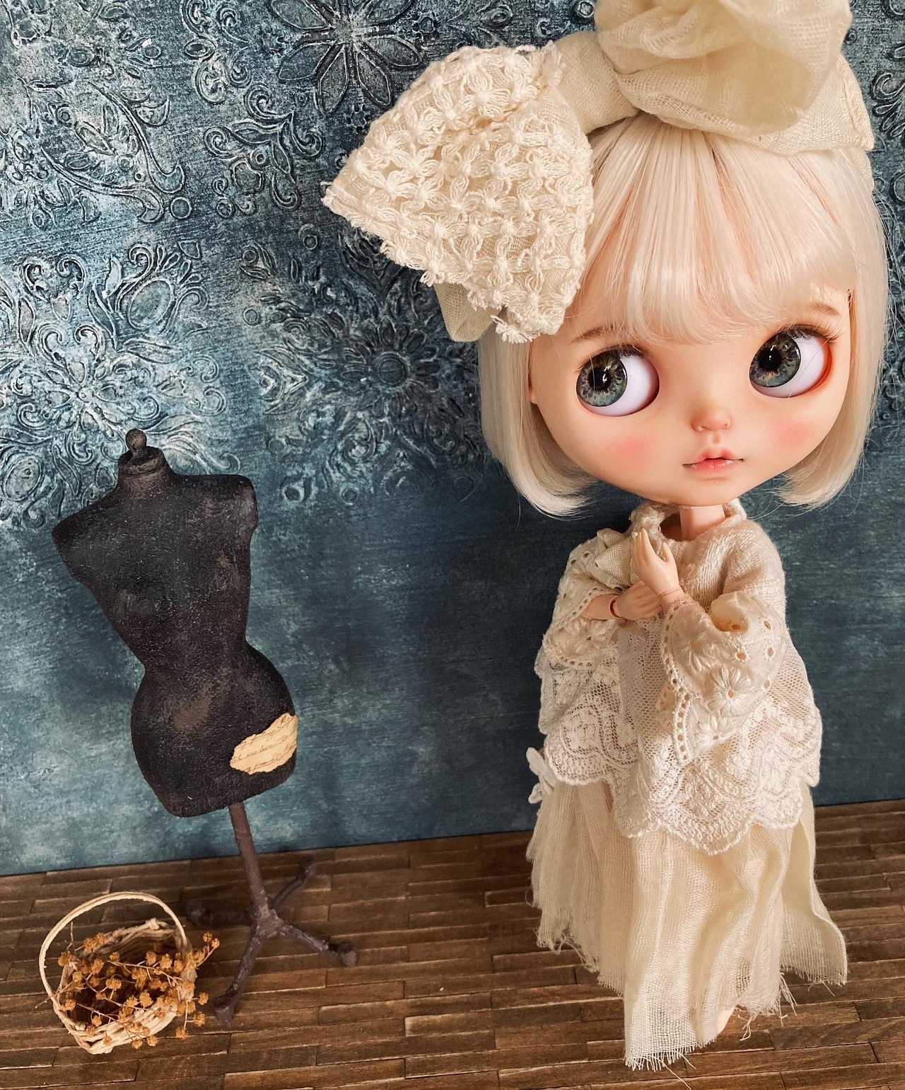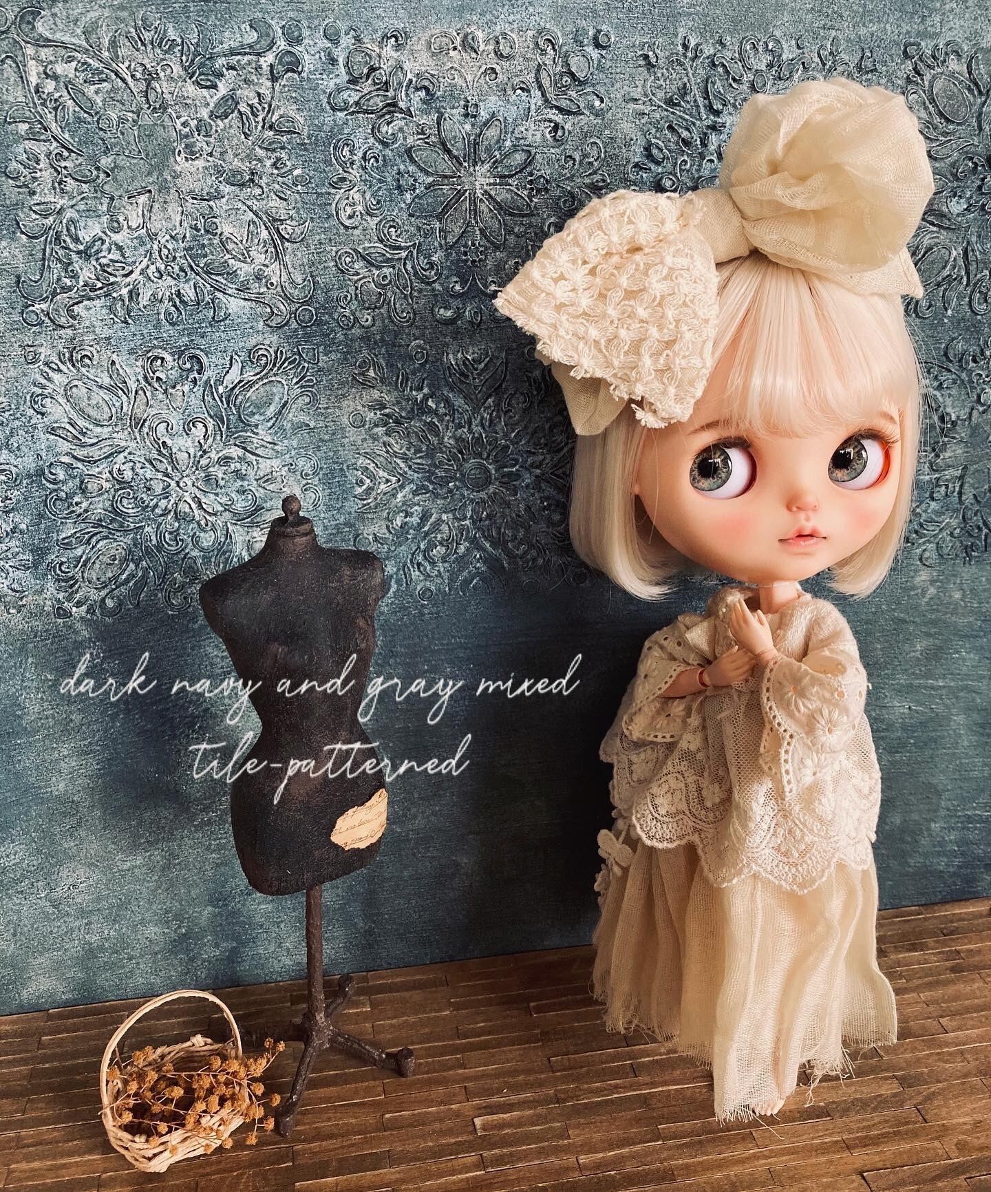 スモークネイビーなタイル柄壁 ミニチュア ドールハウス 背景ボード 壁 床 ブライス リカちゃん 1/6 家具 オビツ 棚 机 ドール ドール家具 カスタムブライス ハンドメイド シャビーシック 小物