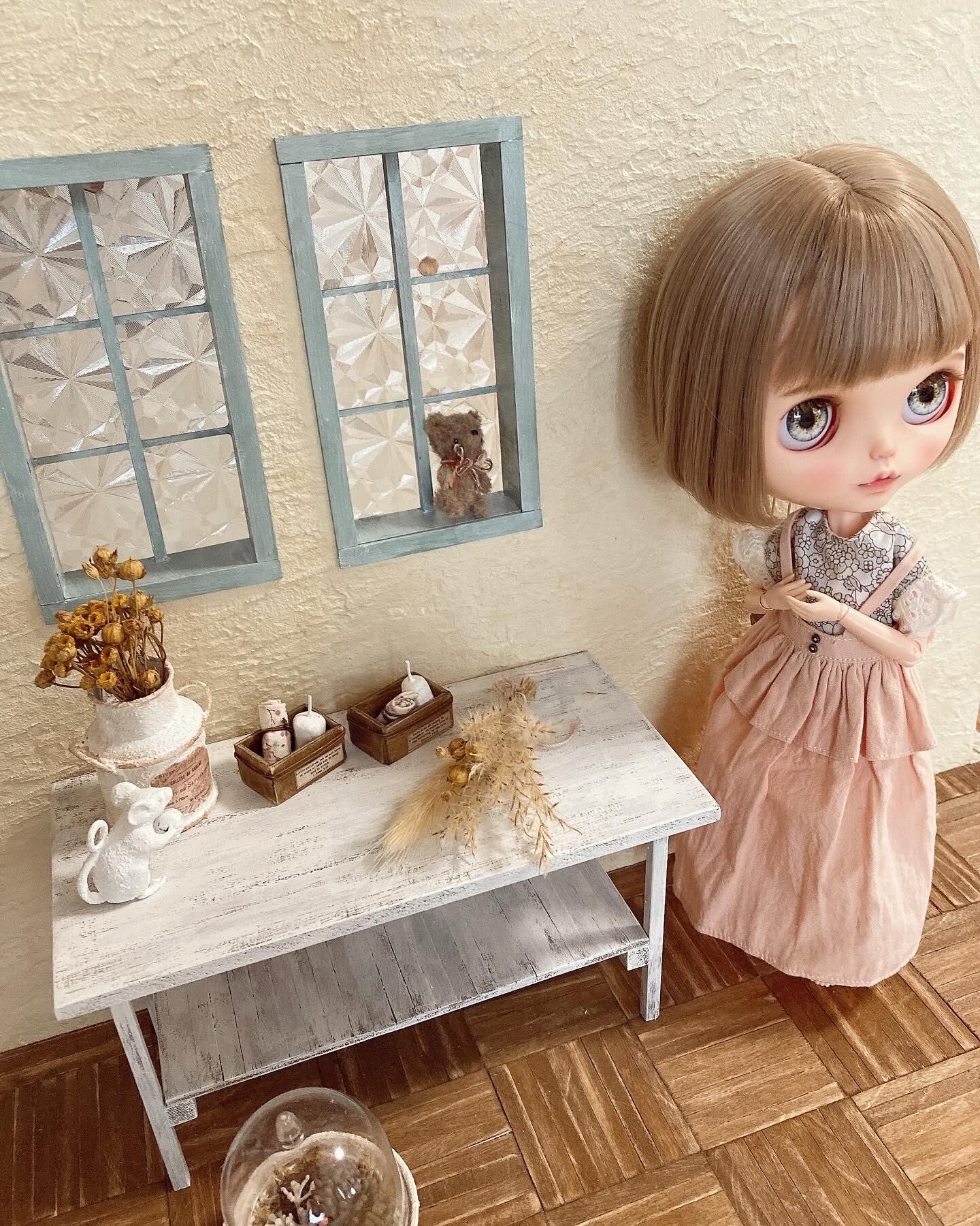 アンティークな木製作業台 ミニチュア ドールハウス 背景ボード 壁 床 ブライス リカちゃん 1/6 家具 オビツ 棚 机 ドール ドール家具 カスタムブライス ハンドメイド シャビーシック 小物